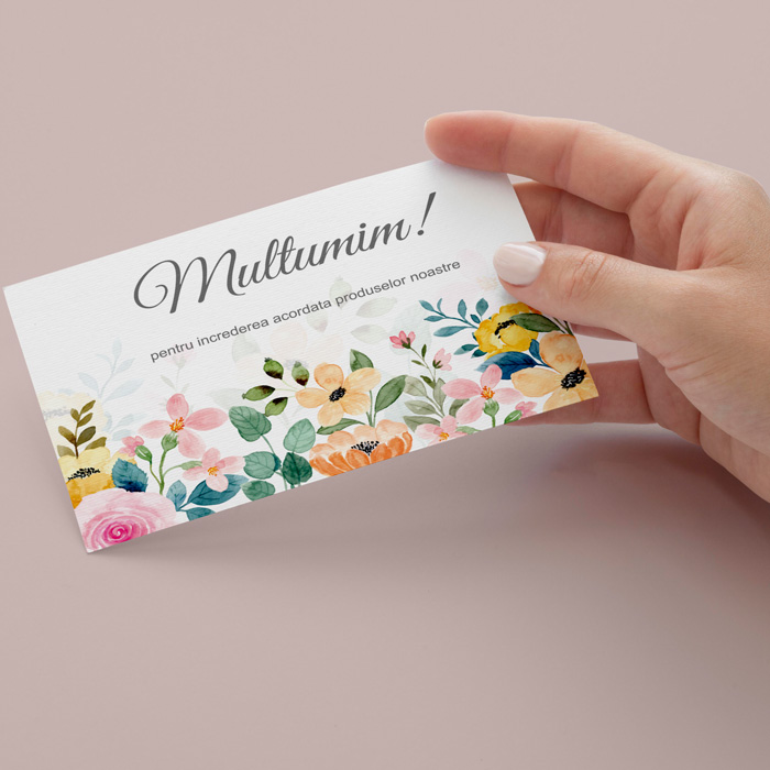 Cardul de multumire este realizat din carton alb semilucios cu greutatea de 300g/m2