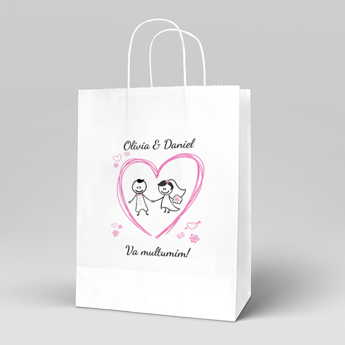 Sacoșe nuntă 14x8x21 cm din hârtie albă personalizate V3